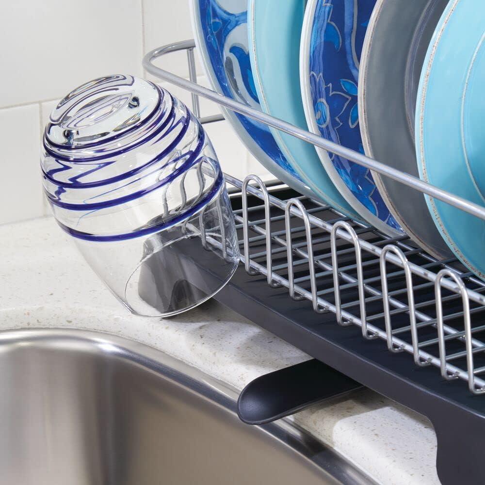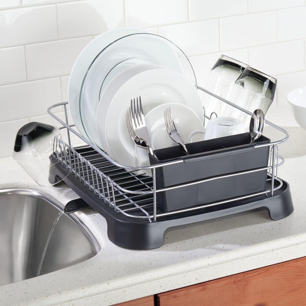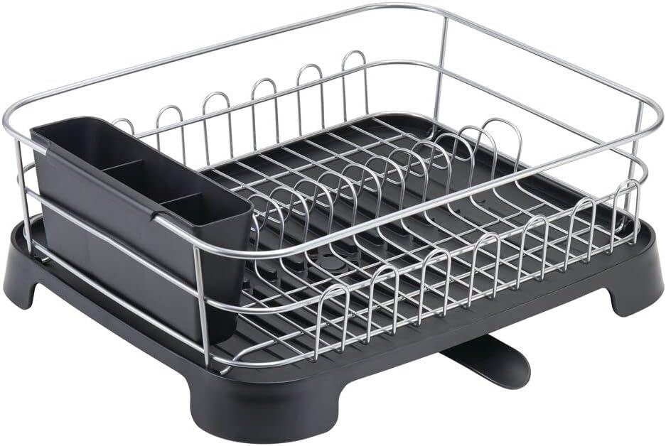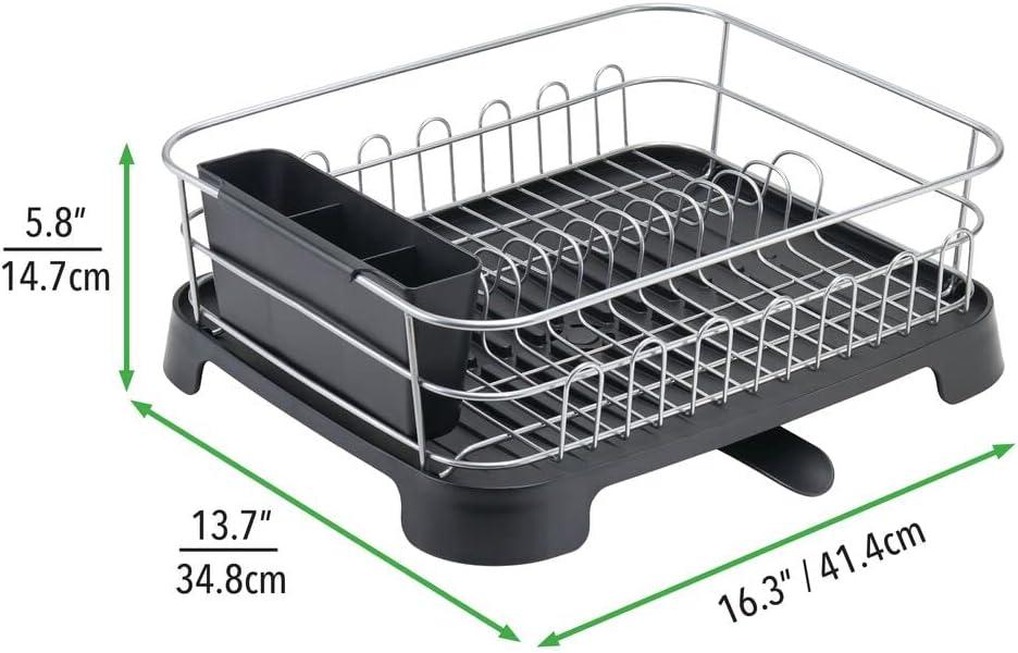 mDesign Alloy Steel Sink Dish Drying Rack Holder w/Plastic Swivel Spout Drainboard Tray - Dish Rack/Dish Drainer Storage Organizer for Kitchen Counter - Holds Plates, Concerto Collection, Silver/Black(Silver/Black)