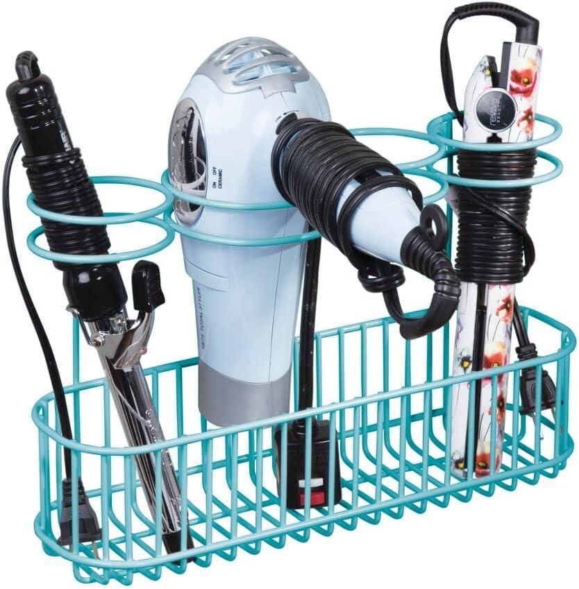mDesign Metal Wire Cabinet/Wall Mount Hair Care & Styling Tool Organizer – Bathroom Storage Basket for Hair Dryer, Flat Iron, Curling Wand, Hair Straightener, Brushes – Holds Hot Tools – Teal/Blue(Teal)