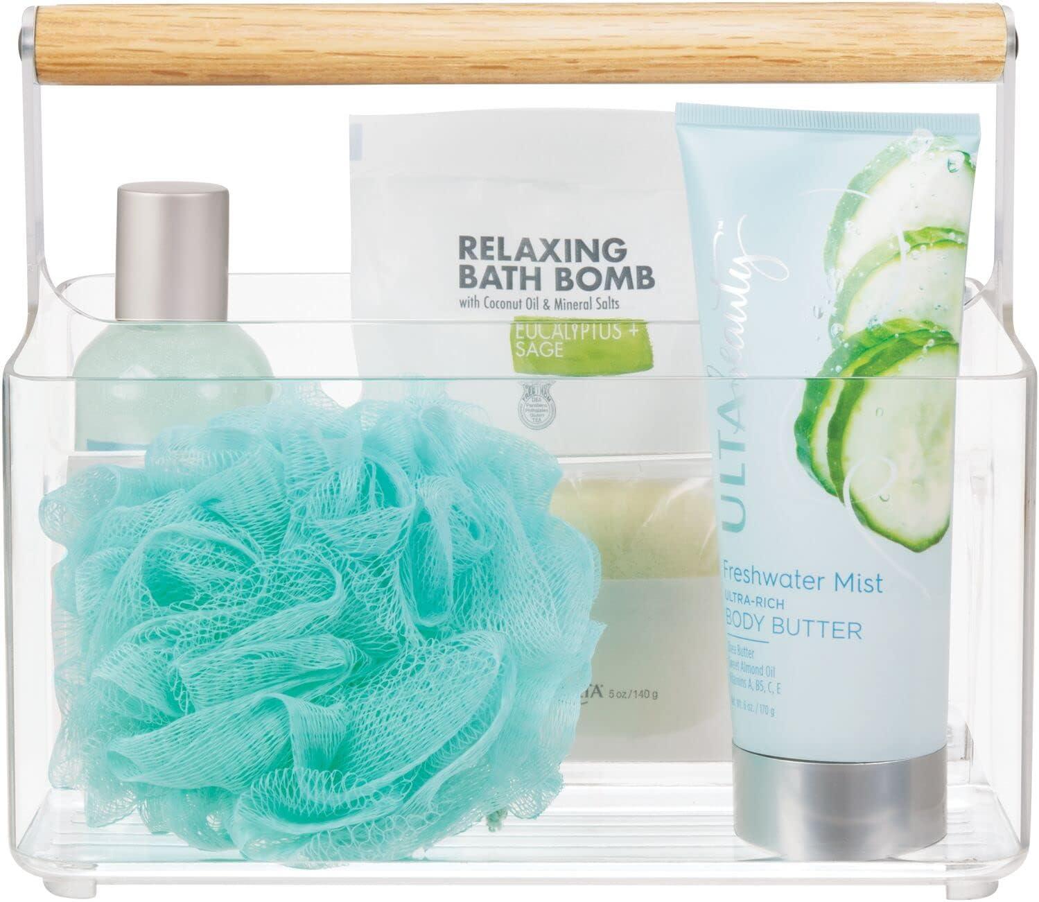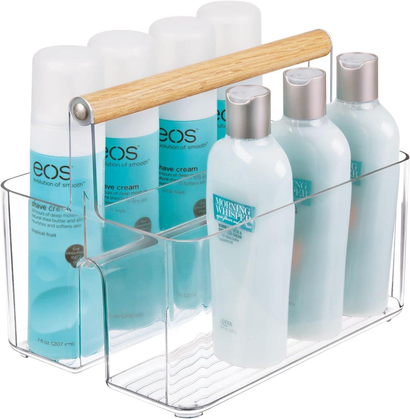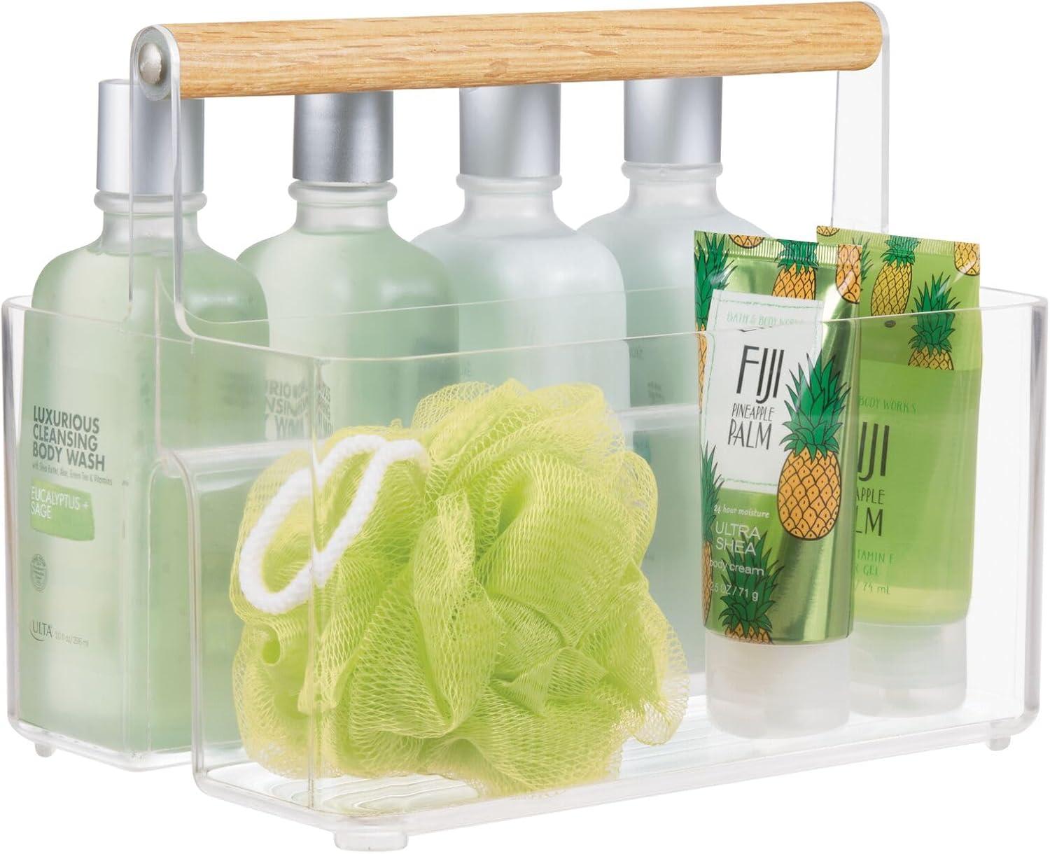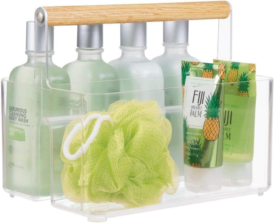 mDesign Plastic Portable Shower Caddy Divided Basket Bin Storage Organizer with Bamboo Handle for Bathroom, Dorm, Shelf & Cabinet Holds Shampoo, Conditioner - Aura Collection, Clear/Natural(Clear/Natural)