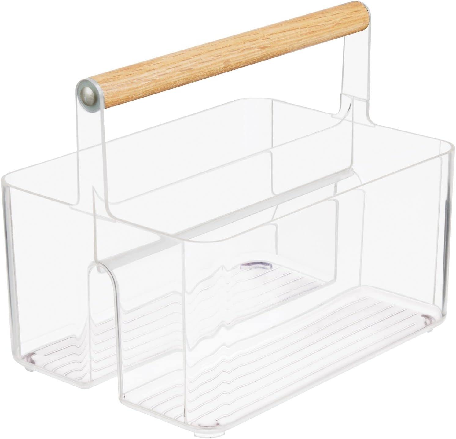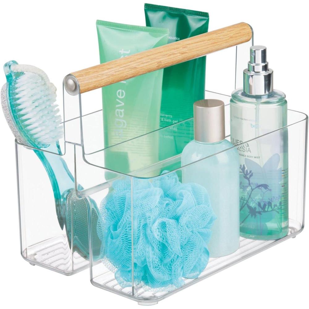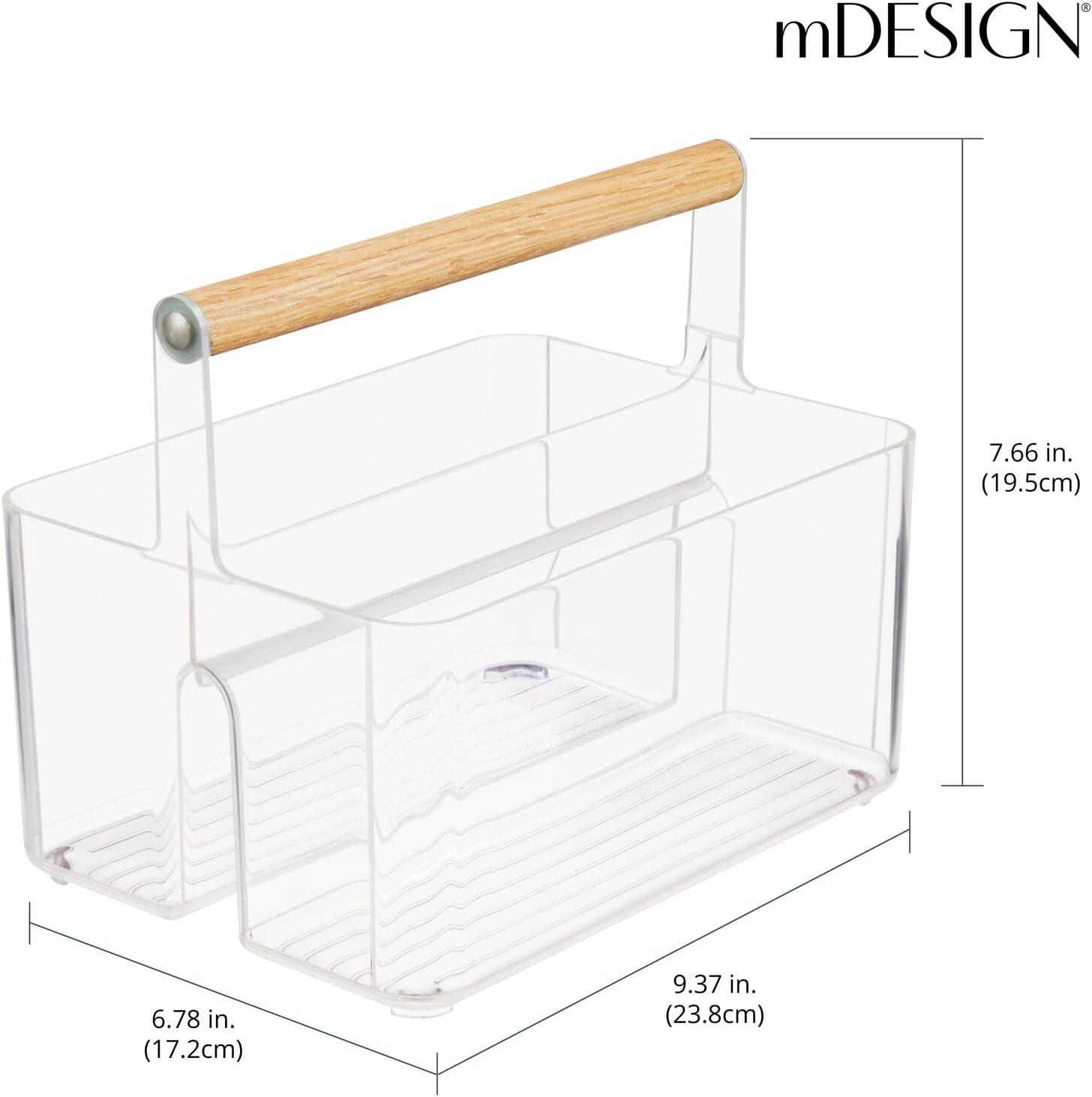 mDesign Plastic Portable Shower Caddy Divided Basket Bin Storage Organizer with Bamboo Handle for Bathroom, Dorm, Shelf & Cabinet Holds Shampoo, Conditioner - Aura Collection, Clear/Natural(Clear/Natural)