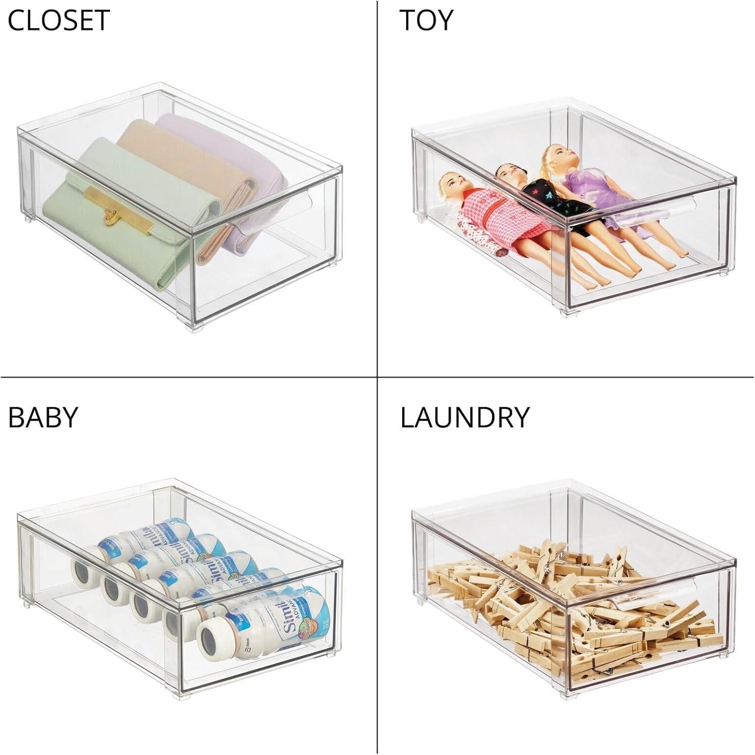 mDesign Plastic Stackable Bathroom Storage Organizer Bin Containers with Front Pull Drawer for Bathroom Countertop, Vanity, Closet Shelves – Holder for Beauty Accessories – Lumiere Collection – Clear(8 x 12 x 4 (Pack of 4))