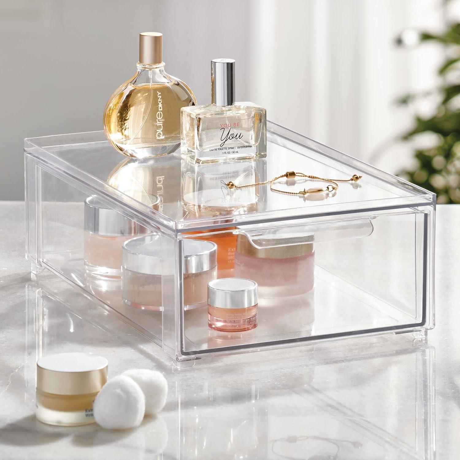 mDesign Plastic Stackable Bathroom Storage Organizer Bin Containers with Front Pull Drawer for Bathroom Countertop, Vanity, Closet Shelves – Holder for Beauty Accessories – Lumiere Collection – Clear(8 x 12 x 4 (Pack of 1))