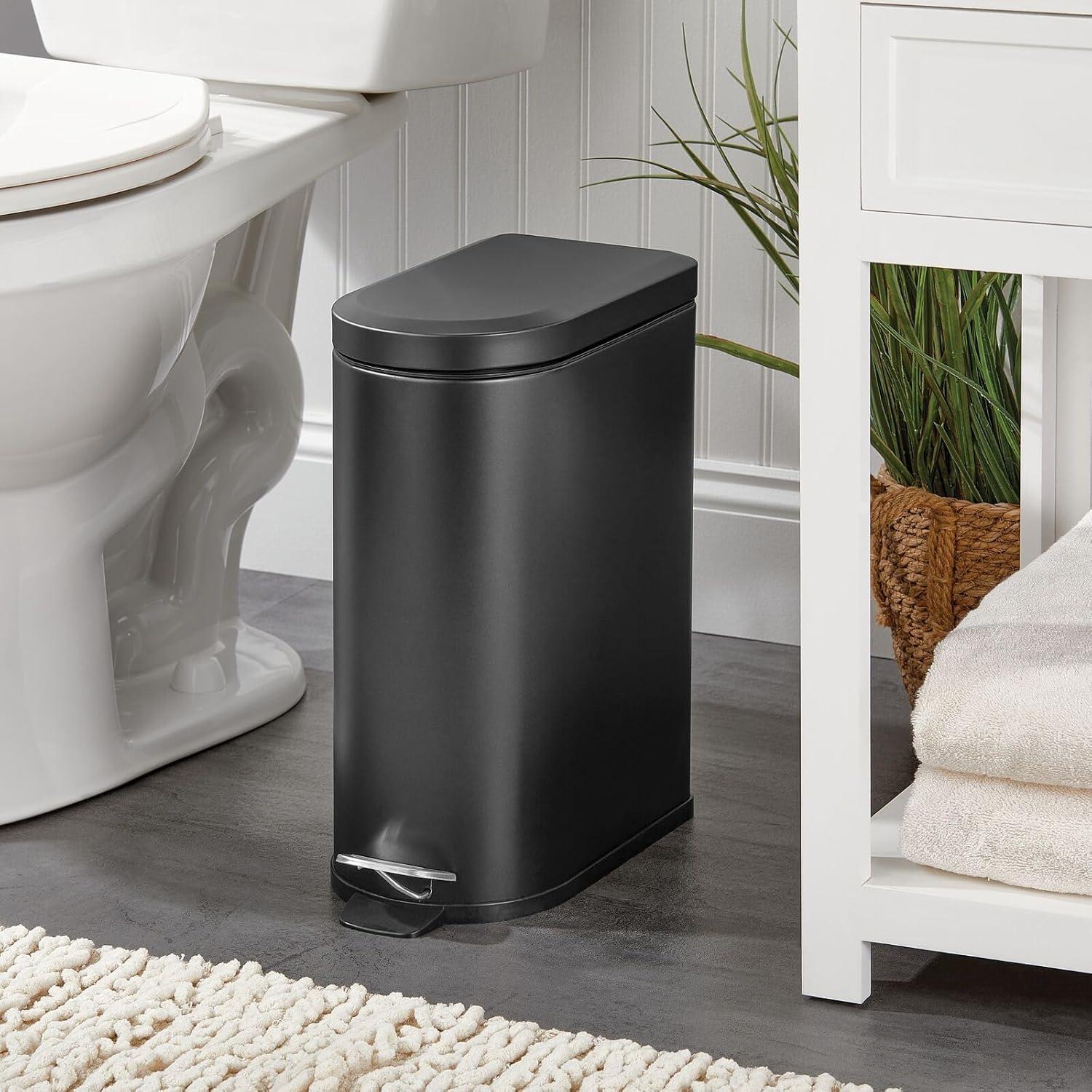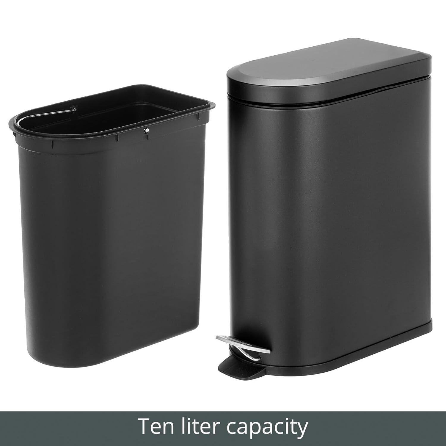 mDesign Small 1.3 Gallon Stainless Steel Metal Step Trash Can Garbage Bin for Bathroom, Bedroom, or Home Office - D-Shape Trashcan with Foot Pedal and Lid - Removable Liner Bucket with Handles, Black(Black)